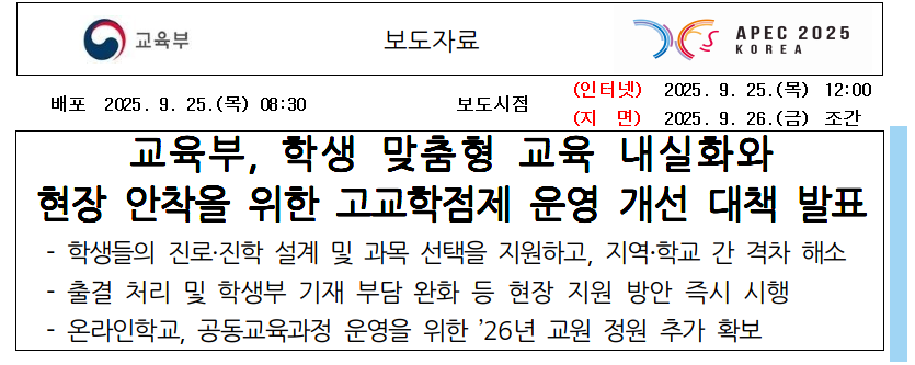 교육부는 2025년 9월 25일(목)에 학생 맞춤형 교육을 내실화하고 고교학점제의 현장 안착을 지원하기 위한 **'고교학점제 운영 개선 대책'**을 발표했습니다. 고교학점제는 올해 고1부터 전면 시행되었으며, 학생의 과목 선택권을 보장하는 학생 중심 교육체제로의 전환을 위해 도입되었습니다.